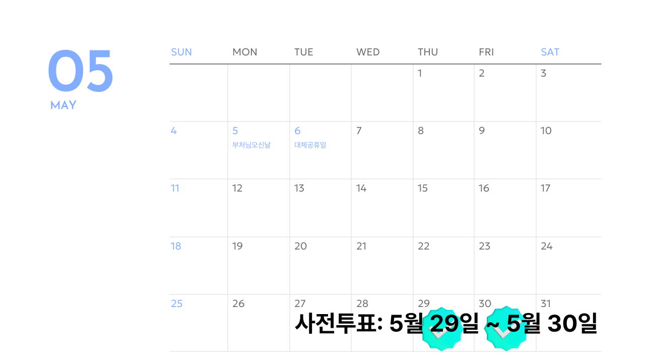 - 사전투표일: 2025년 5월 29일(목) ~ 5월 30일(금), 오전 6시 ~ 오후 6시